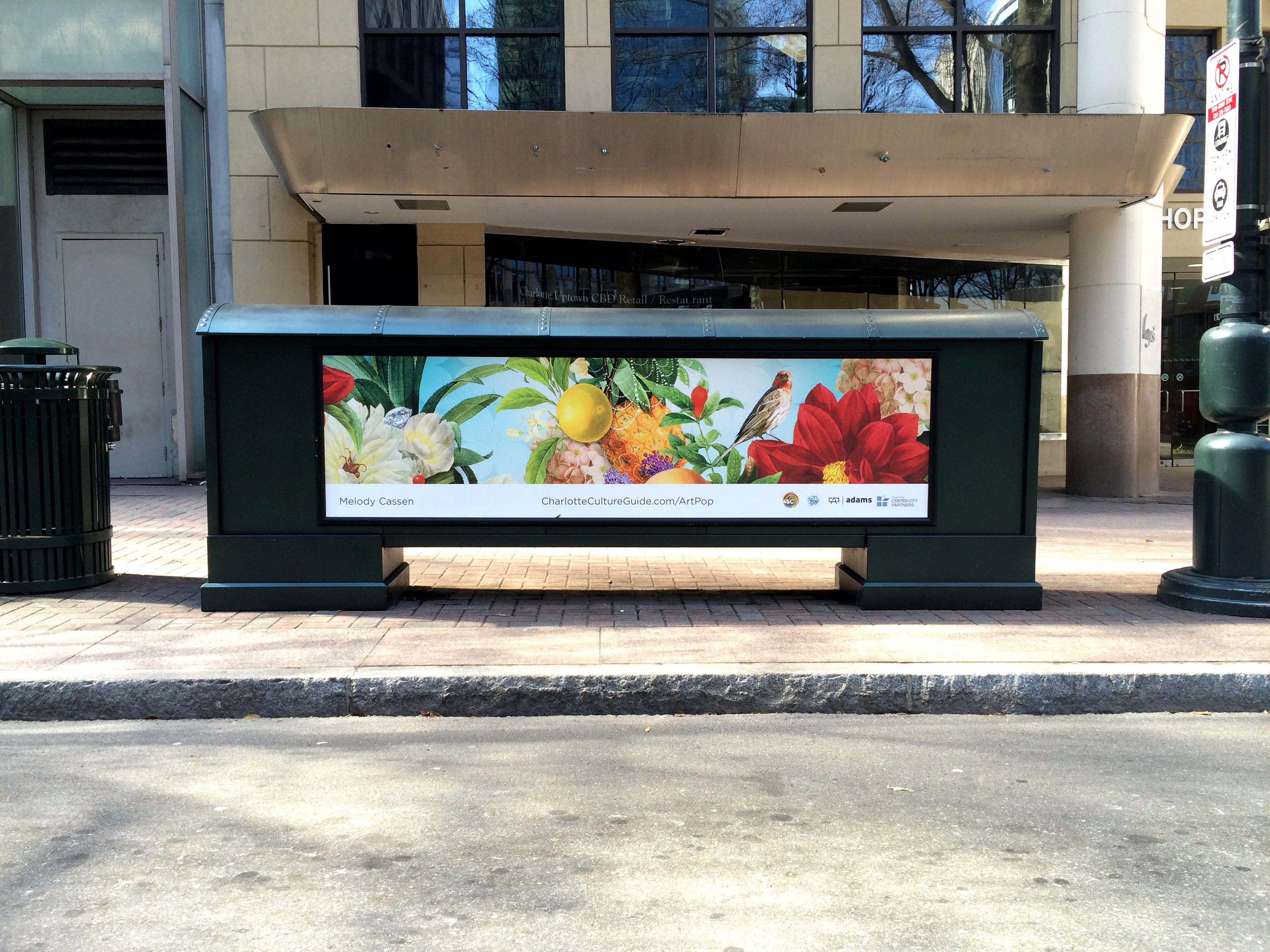 As signage at a local bus stop in uptown Charlotte, NC.