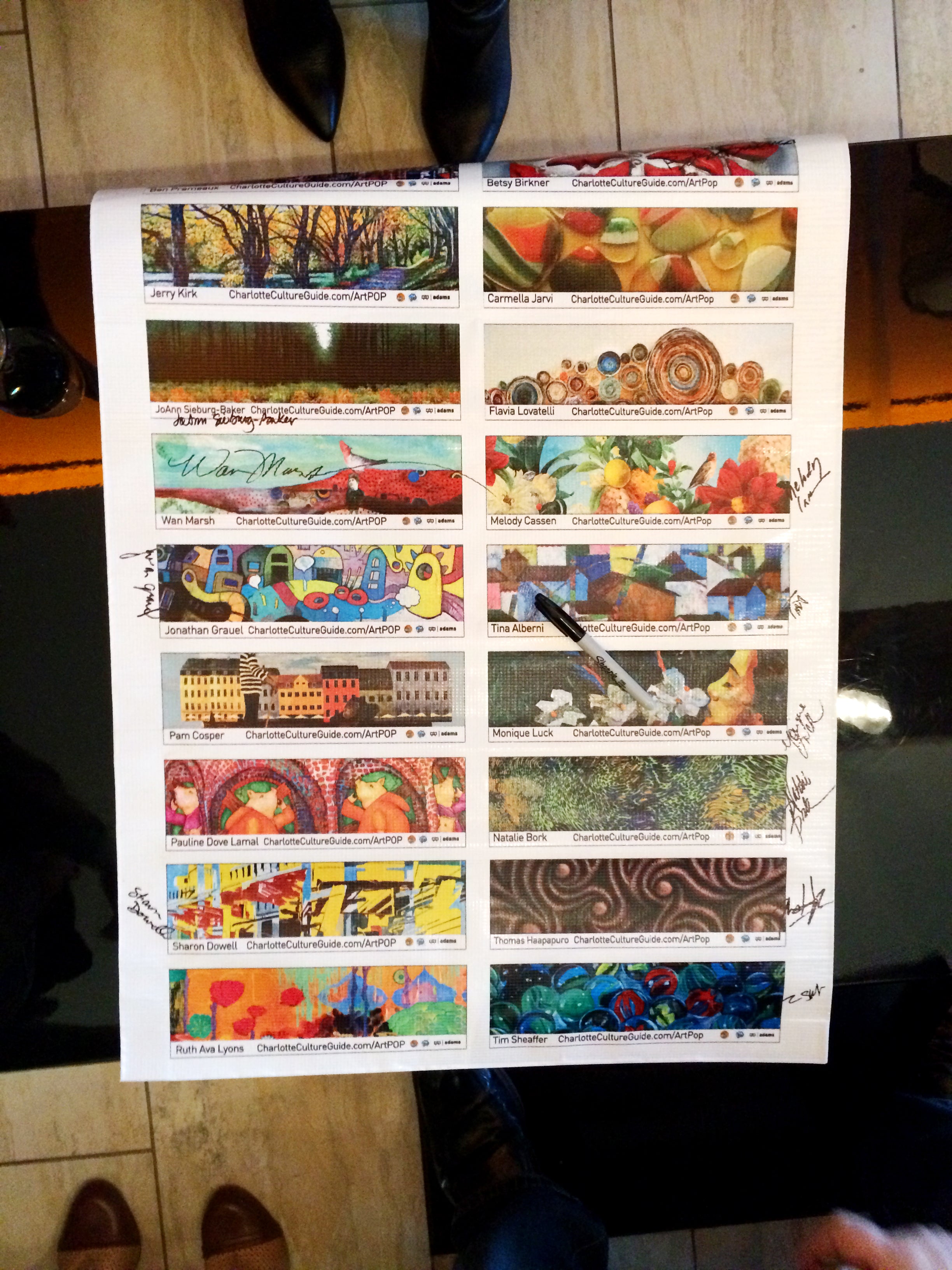 Print out of the collective class of ArtPop Street Gallery artists, with signatures beside their respective artwork.