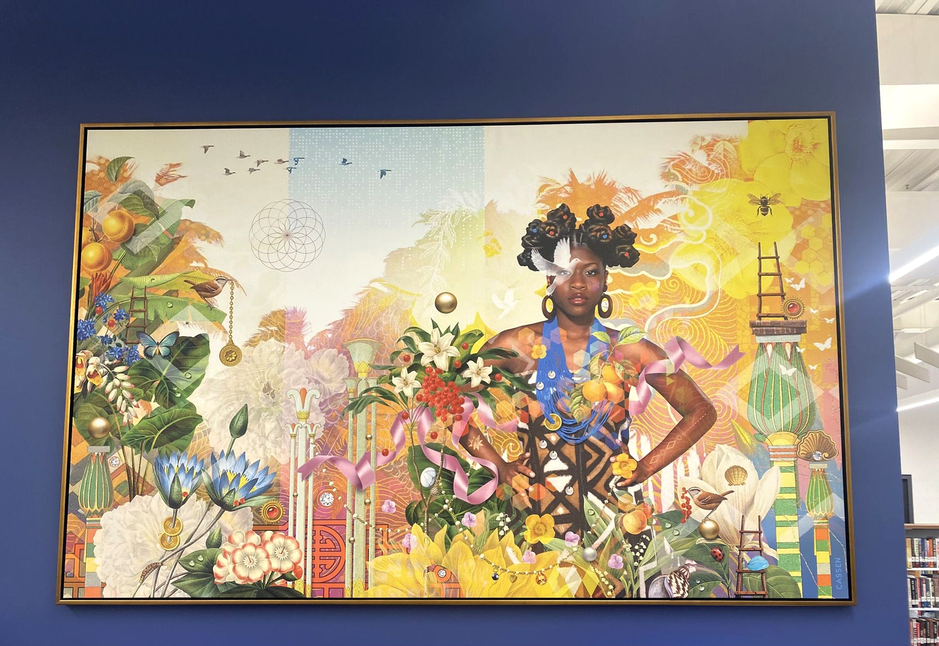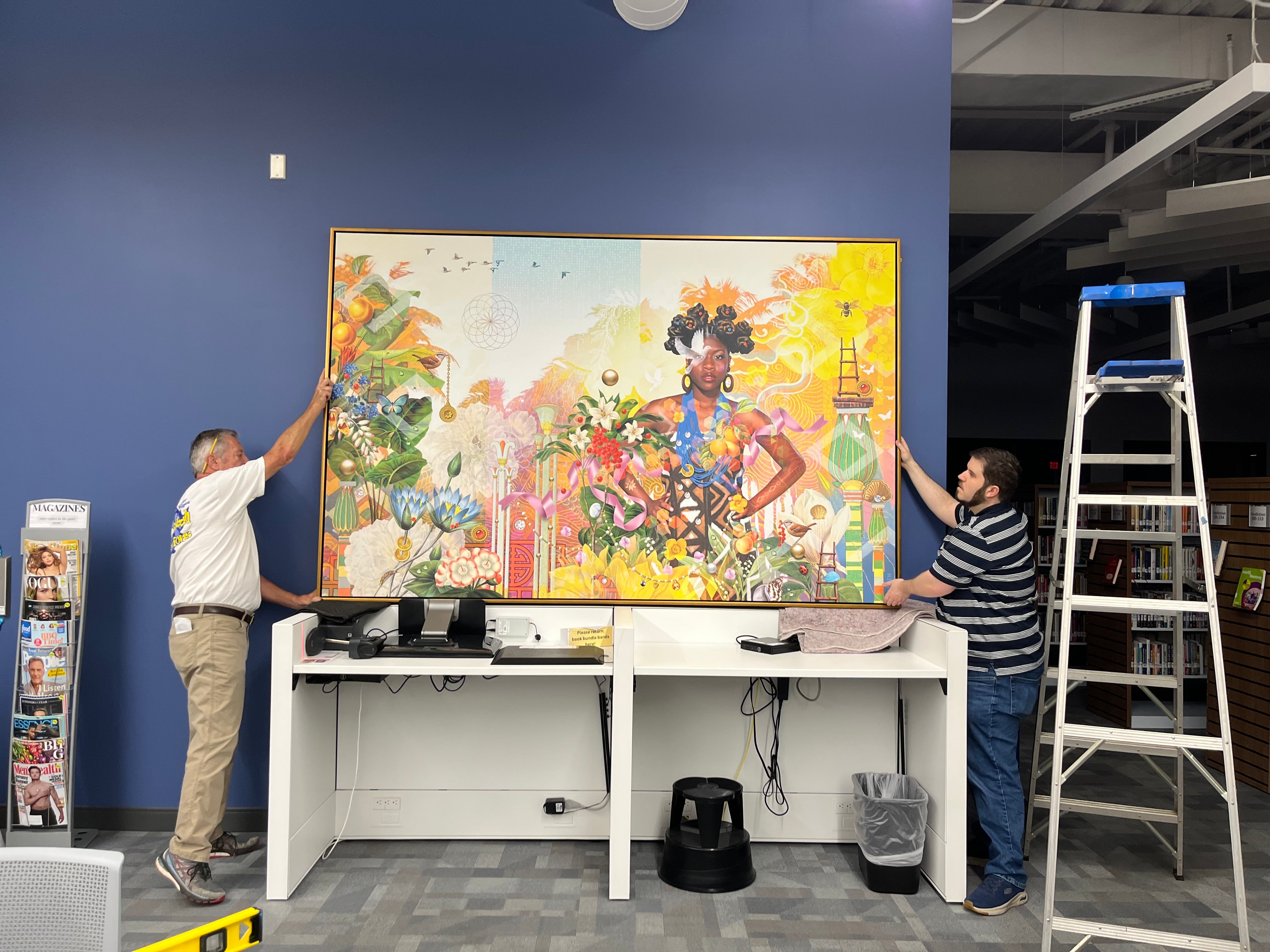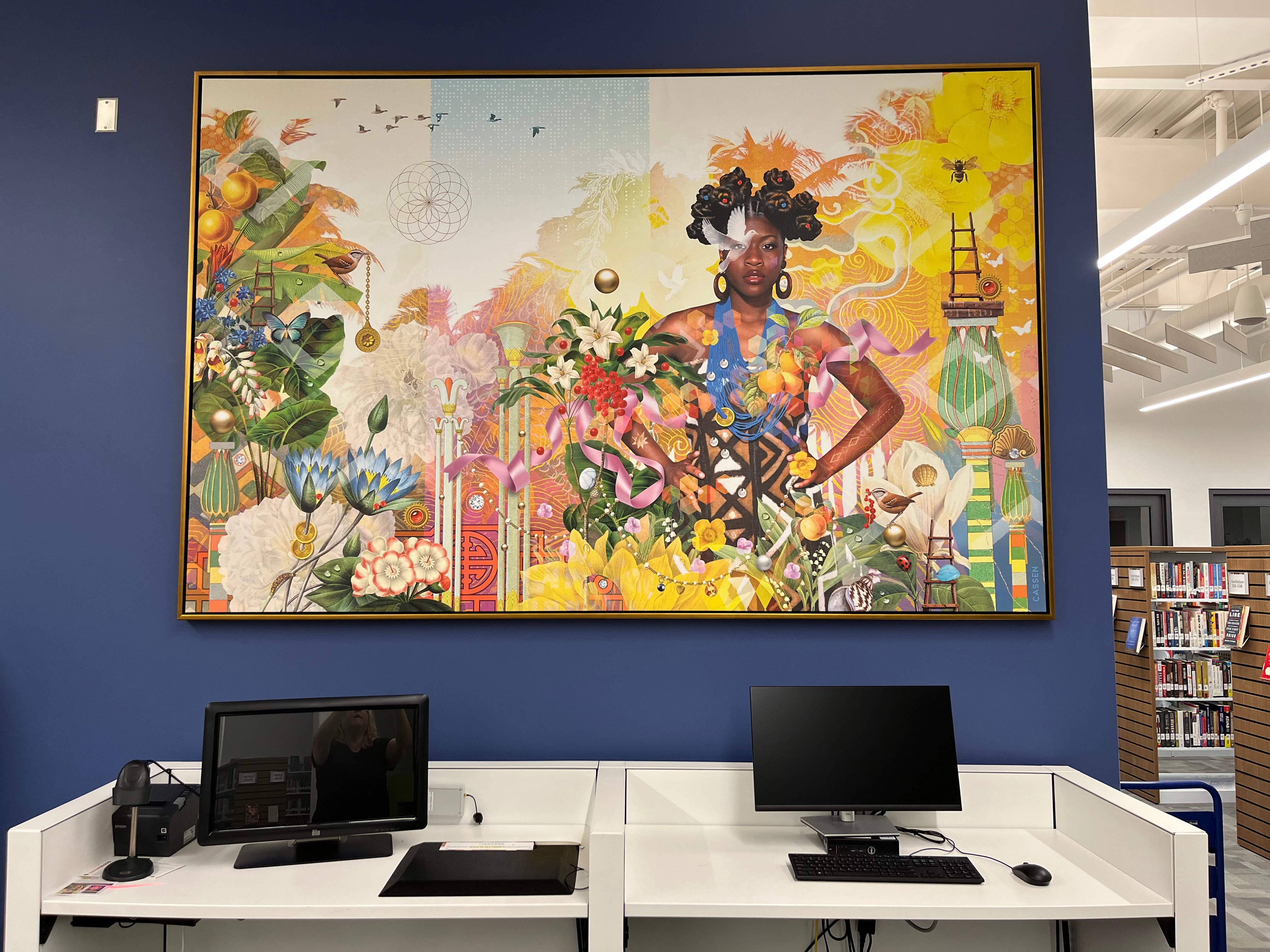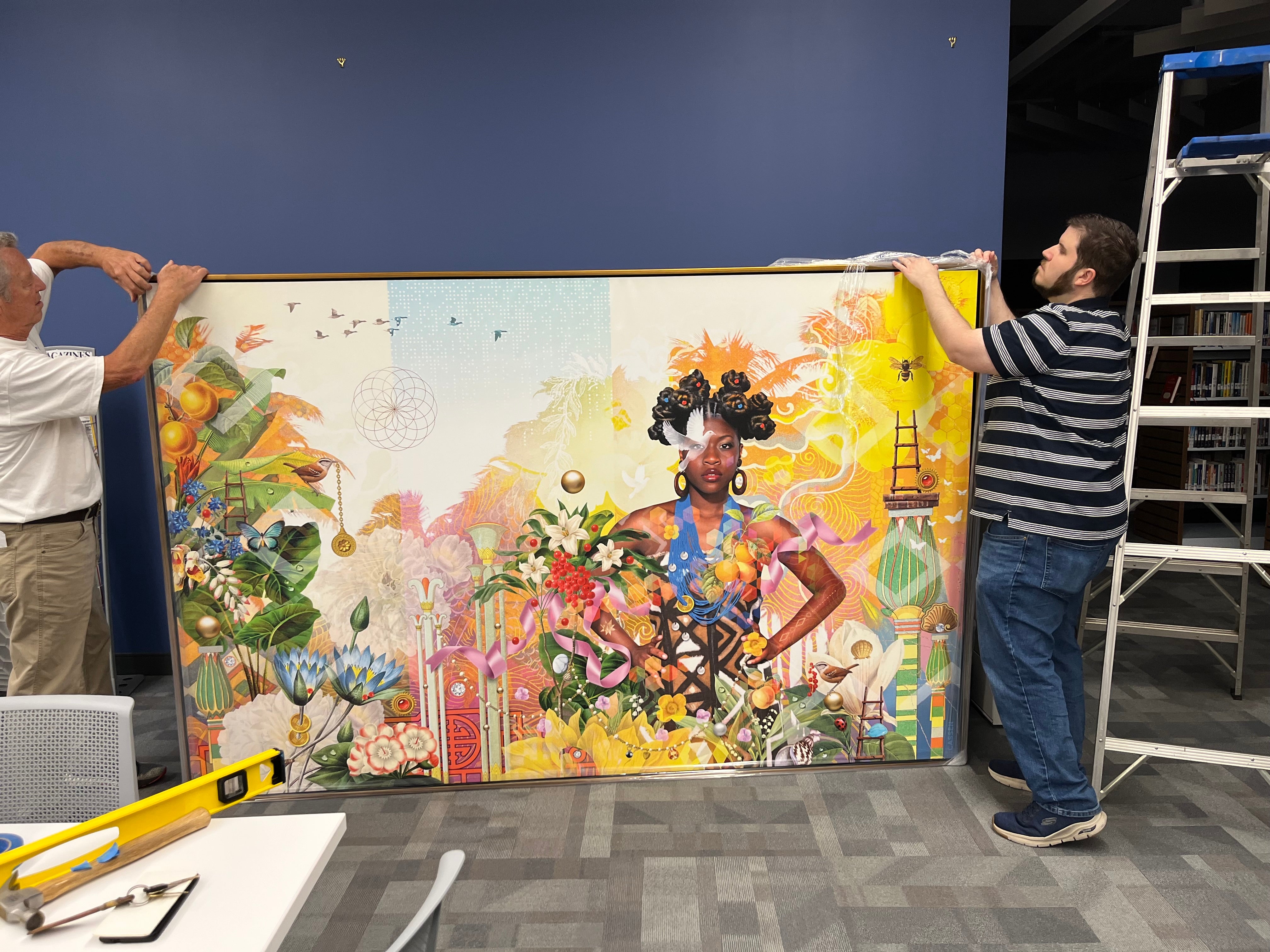 Project Overview: Charlotte Mecklenburg Library commissioned artwork for the Pineville branch location. Curated by Tony Tallent. Permanent collection of the Charlotte Mecklenburg Library. Digital collage and photography, archival print on stretched canvas with floater frame, 101" x 65".